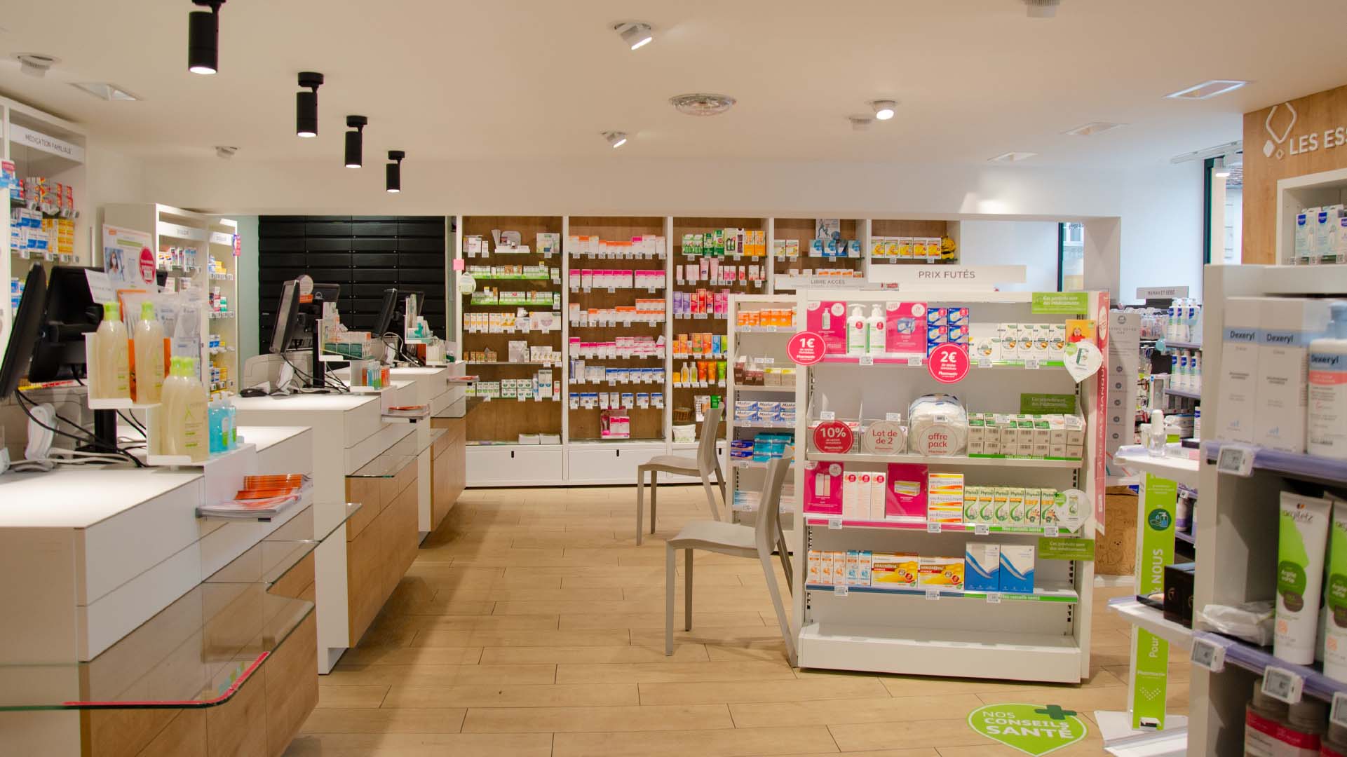 Pour ce qui est de l’extérieur, la pharmacie Hemmer est implantée dans un bâtiment classé aux monuments historiques. Une nouvelle façade et son enseigne ont donc été créées en regard des règles exigeantes liées à ce type de bâtiment.