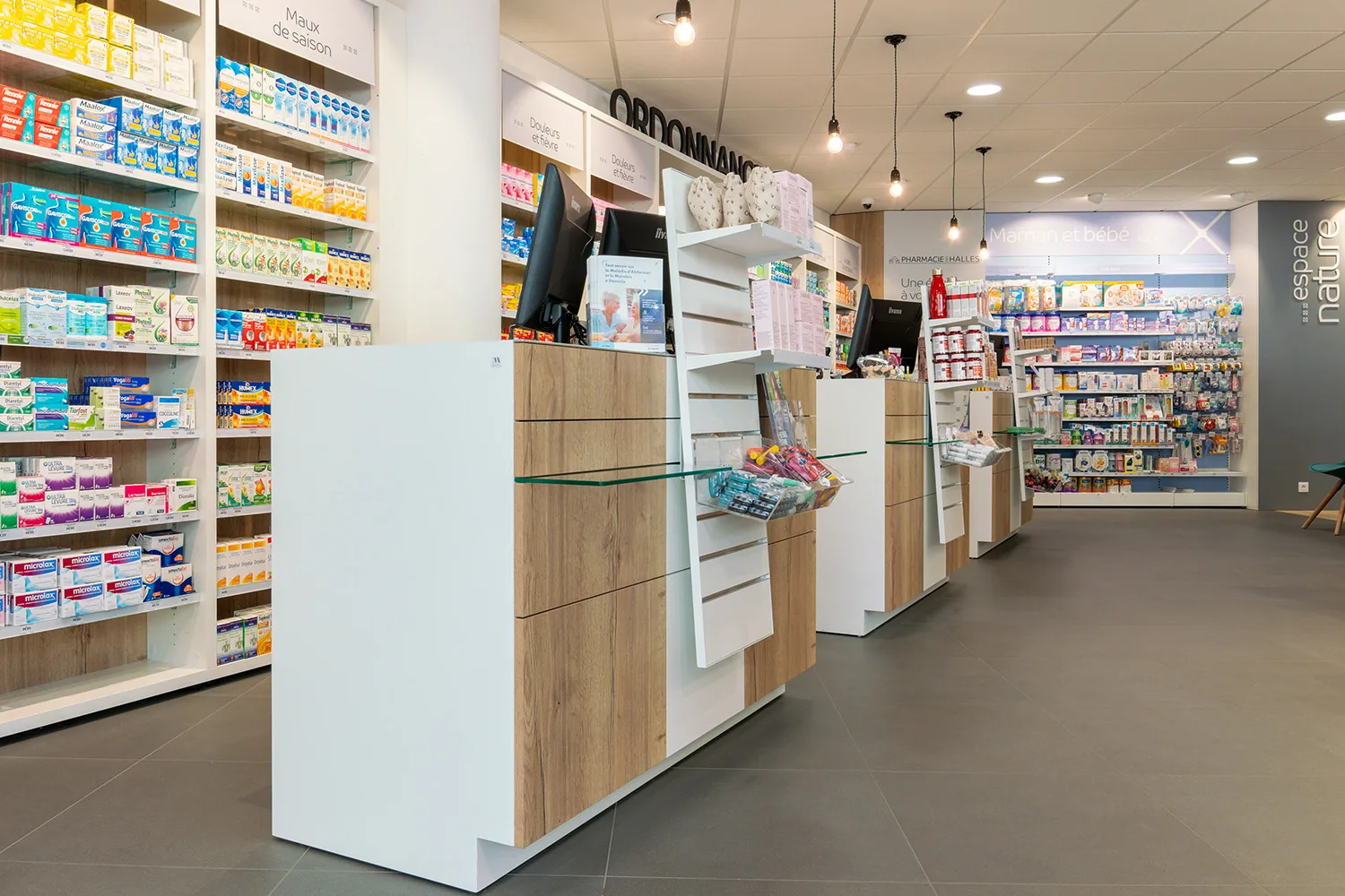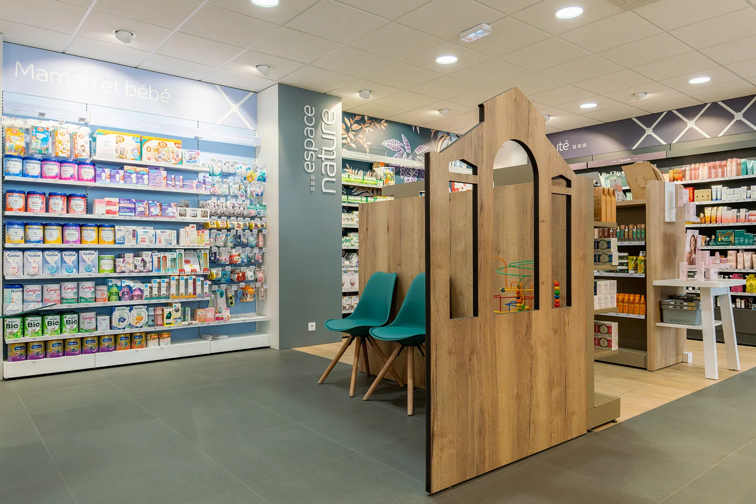 Optimisation de l’espace de vente officinal et de conseil et optimisation des mètres linéaires développés. Création complète du backoffice, création d’un local préparatoire et d’un local PDA aux normes ARS. Création d’une cabine HPST (confidentialité) et vaccination. Création d’un espace d’aromathérapie et de phytothérapie.